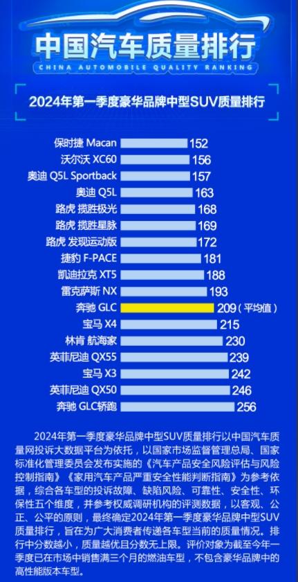 日前,中國汽車質量網發布《2024年第一季度豪華品牌中型SUV質量排名》。此次,共有17款車型參與評選,測評平均分達到209分,分數越小代表車型的質量越好。