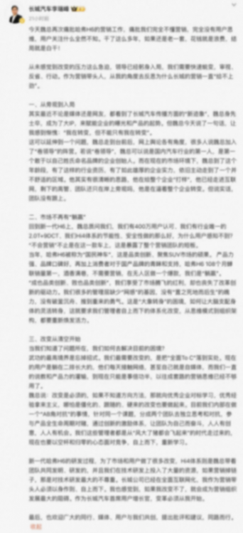 最近,李瑞峰在個人社交平臺表示:魏建軍痛批哈弗H6的營銷工作,完全不懂營銷,沒有用戶思維,干了這么多年,如果還是老一套,花錢就是浪費,結局就是白干。并總結稱:作為營銷帶頭人,自己要反思,并歡迎同行、媒體、用戶提出建議和批評。