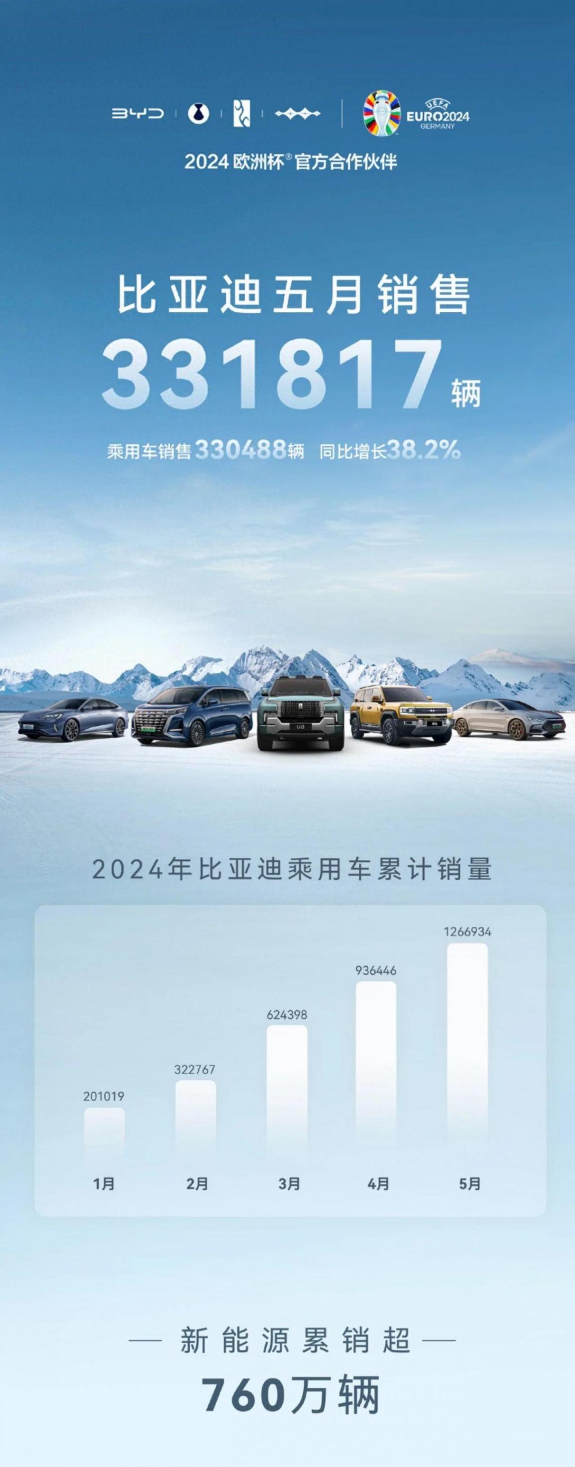 頂流一哥比亞迪繼續(xù)穩(wěn)固全球最大的新能源汽車廠商地位,5月份旗下四大品牌比亞迪、騰勢、方程豹、仰望總銷量為331817輛,同比增長38.2%。