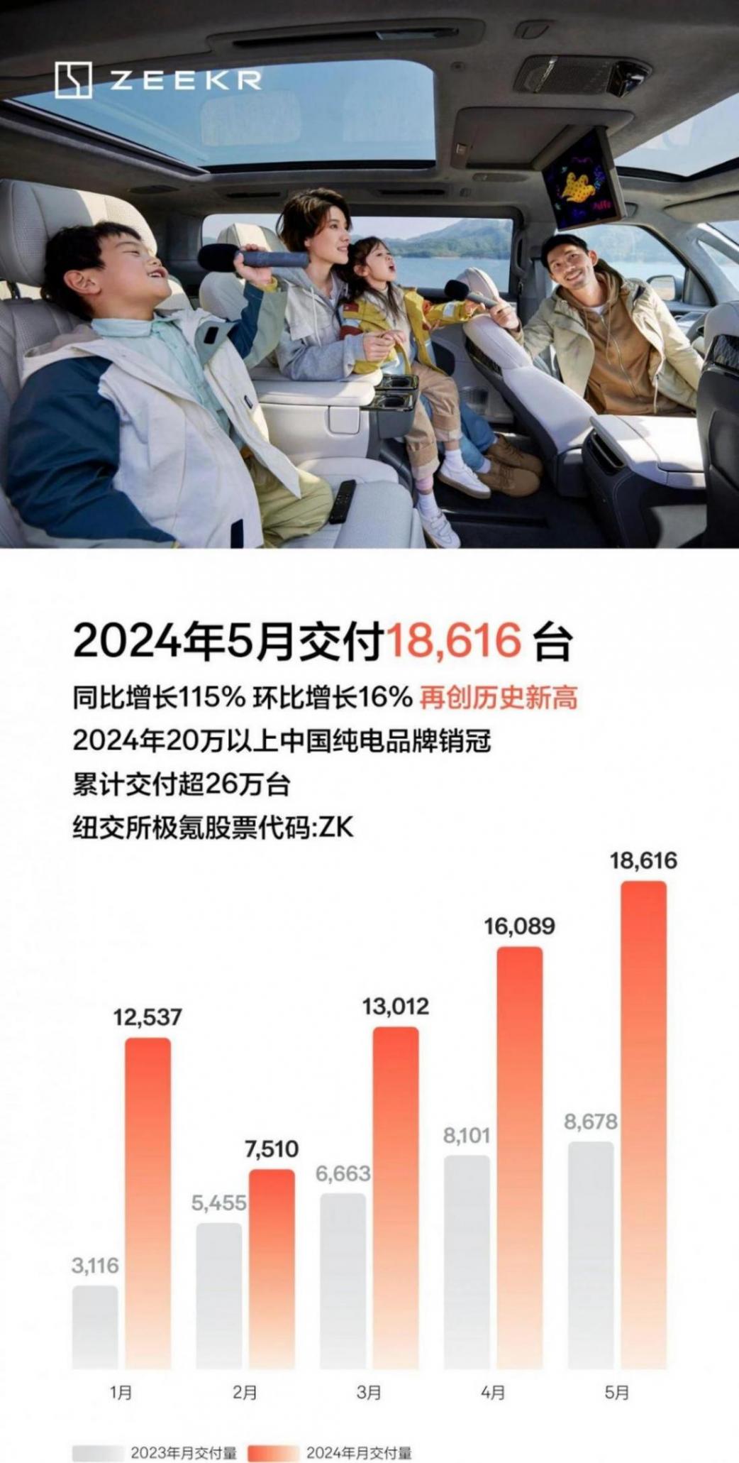 極氪母公司為大吉利汽車集團(tuán),作為大吉利面向市場推出的中高端純電品牌,極氪混得一直很不錯(cuò)。5月交付18,616臺(tái),同比增長115%,環(huán)比增長16%。