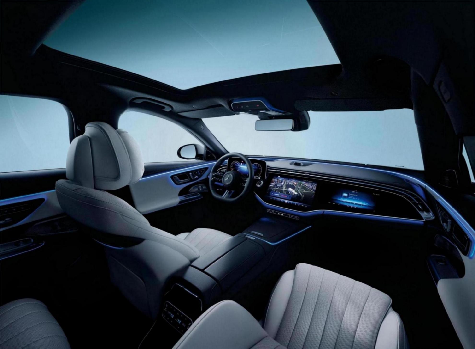 內飾方面,新車配備全液晶儀表以及大尺寸全新MBUX超級屏(MBUX Superscreen),其使用一整塊玻璃面板覆蓋中控屏與副駕駛前方顯示屏,結合三輻式多功能方向盤和貫穿整個中控的多色主動式環境氛圍燈系統營造出極具科技感的座艙體驗。