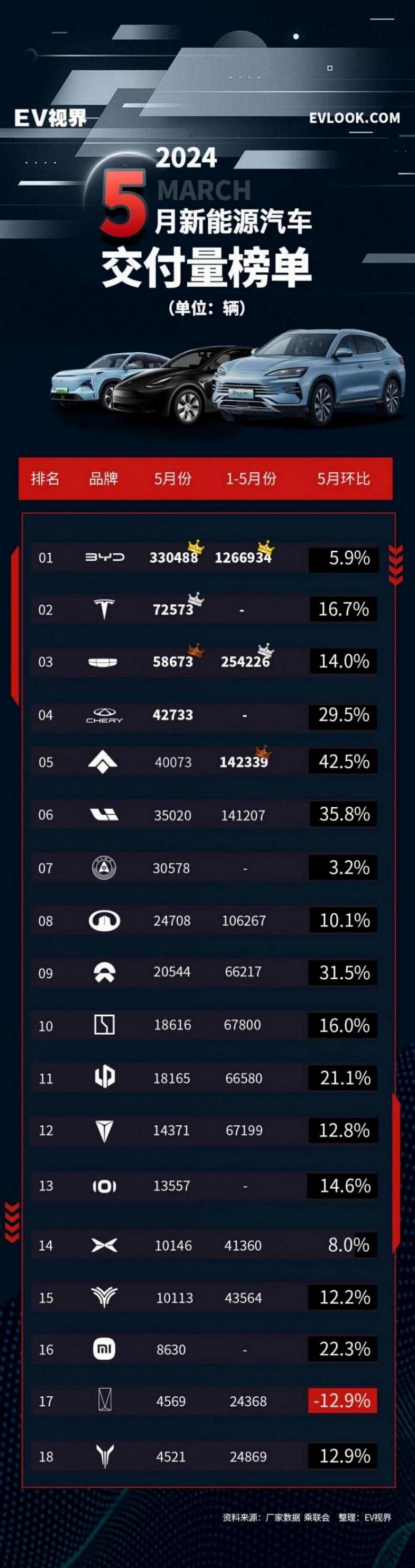 車市的“價格戰(zhàn)”一直在火熱進行中,特別是在北京車展結(jié)束后的5月,開始出現(xiàn)了一些積極的信號。"五一"小長假的刺激,加上"以舊換新"等政策的推動,消費者的購車需求得到了進一步的釋放,大家對汽車市場的關(guān)注度和購車熱情也隨之提升。5月,很多車企的銷量都實現(xiàn)了環(huán)比增長,尤其是新勢力品牌的銷量回暖非常明顯。近日,不少車企都紛紛公布了自己的銷售成績。下面我們就來看一看5月新能源車企排名的具體情況。