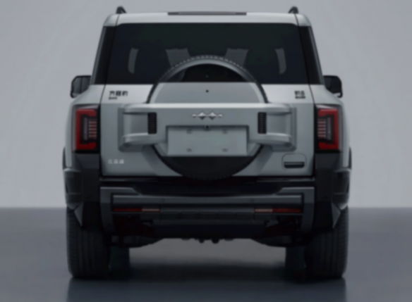 在車尾部分,背書包式備胎罩融入精致的車身同色護板,看起來更加高級。“C”字形尾燈組縱向鑲嵌在尾門兩側,與前大燈相呼應,后包圍有著復雜的多層方形裝飾,繼續營造硬派風格。