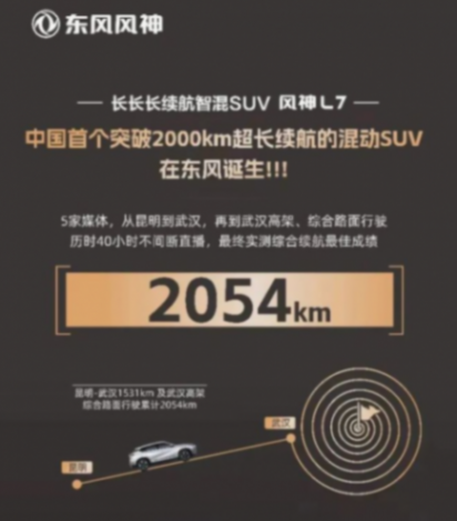 L7是東風風神旗下首款插混車型,價格區間為12.89萬元-15.69萬元,這款車型主打長續航、低油耗。就上市前的一周,風神L7通過直播的形式完成了2000公里的長測,是國內實測突破2000km超長續航的混動SUV。