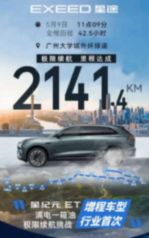 5月初,奇瑞星途星紀元ET開啟了長測,挑戰測試車輛從安徽省蕪湖市出發,歷經42.5小時抵達廣州大學城外環綠道,最終跑出2141.4公里的續航。