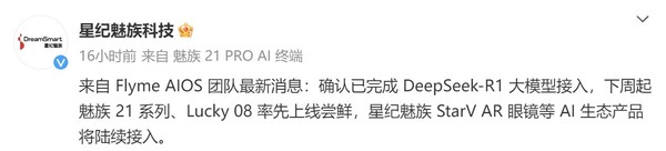 星紀(jì)魅族宣布接入DeepSeek-R1 手機(jī)、AR眼鏡都能用