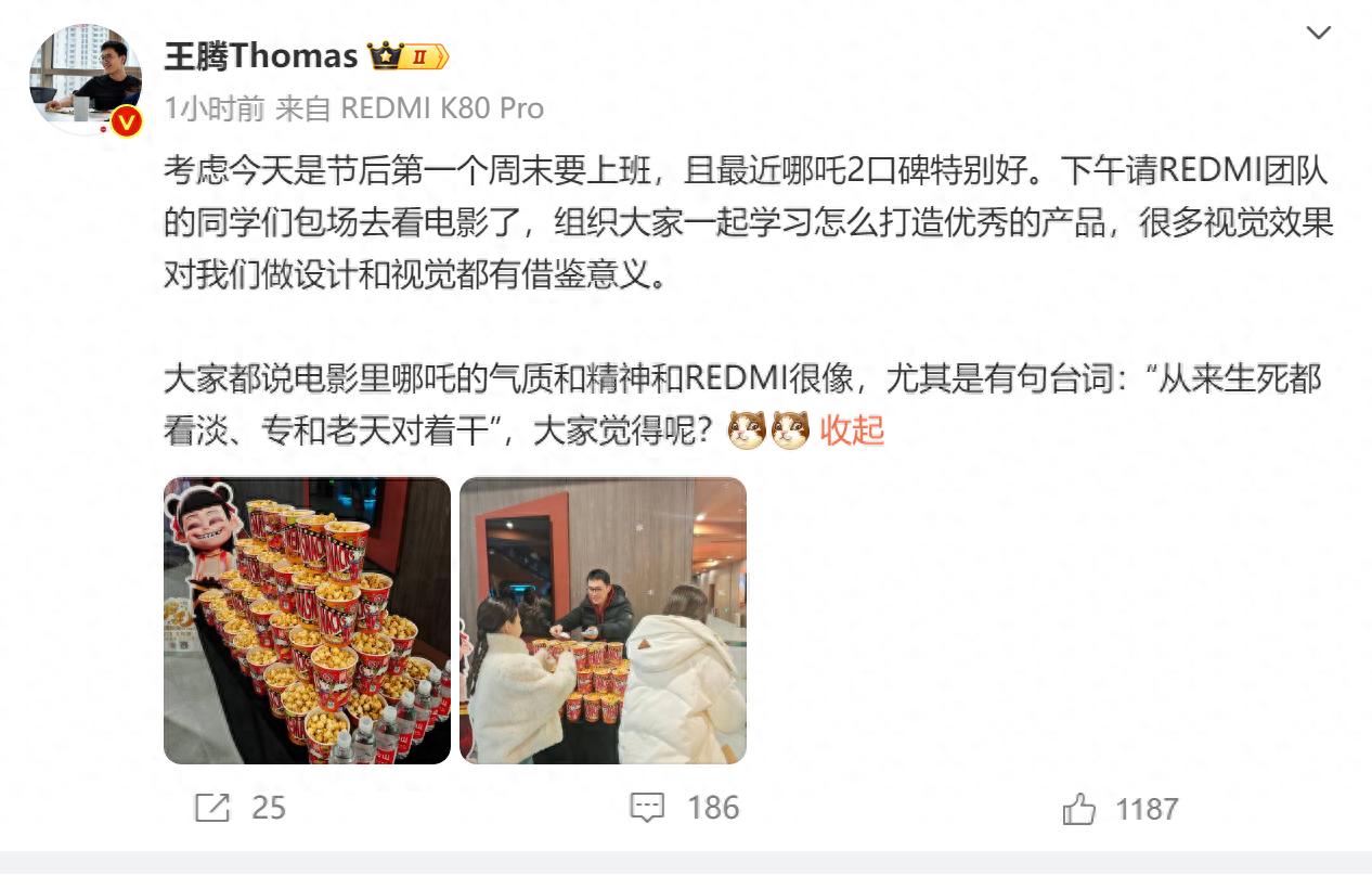 哪吒2大紅大紫,目前票房突破70億,自然也有一些公司單位包場去看,小米就是如此,這次包場去看的是REDMI團(tuán)隊(duì),而且是王騰親自帶隊(duì),王騰請REDMI團(tuán)隊(duì)包場去看電影,然后借口都有,說是要大家一起學(xué)習(xí)怎么打造優(yōu)秀產(chǎn)品,很多視覺效果對我們做設(shè)計(jì)和視覺都有借鑒意義。