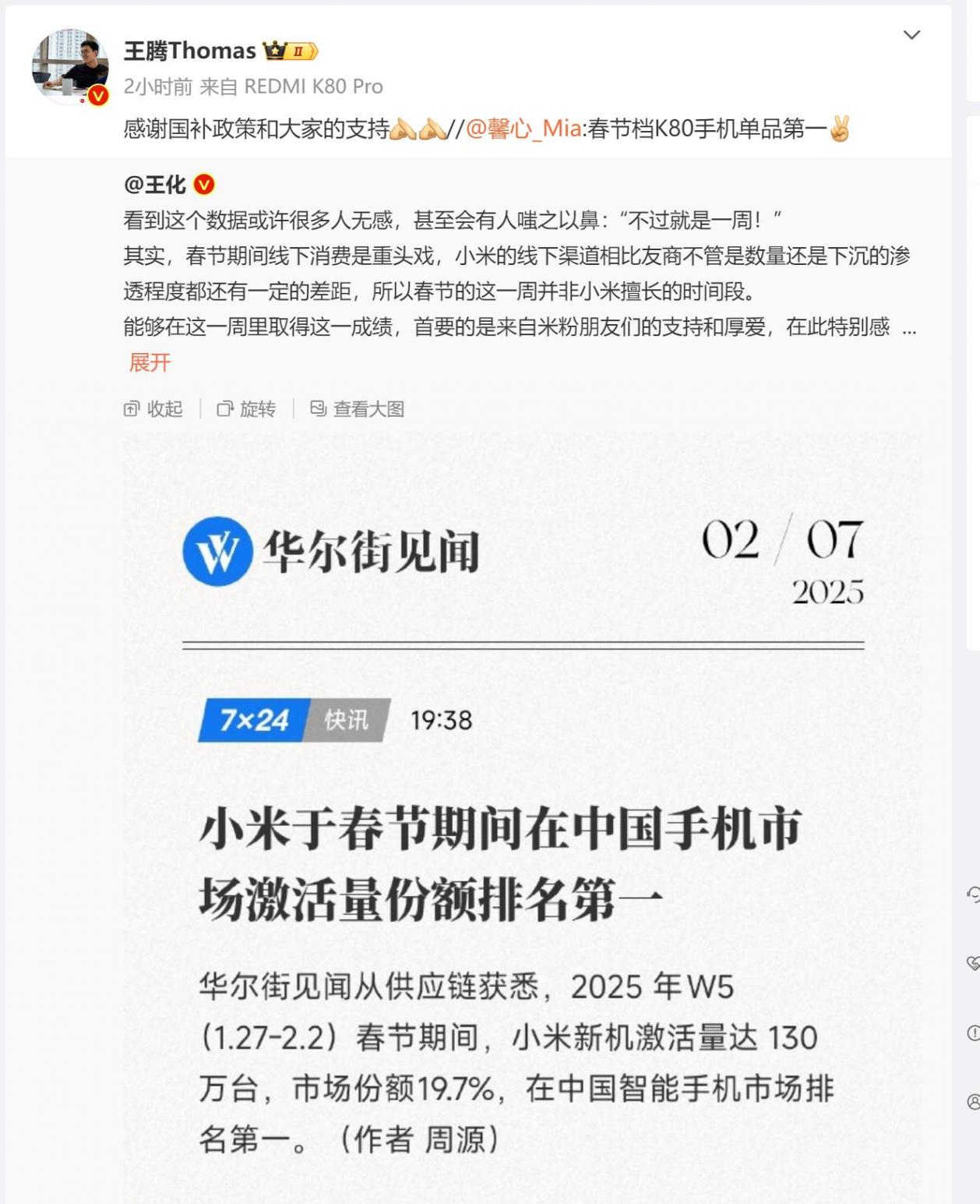 小米現(xiàn)在銷量大戶自然是紅米,美女產(chǎn)品經(jīng)理級馨心也是很開心轉(zhuǎn)發(fā)表表示,春節(jié)檔K80手機(jī)單品第一,王騰也跟著補(bǔ)充說明,感謝國補(bǔ)政策和大家的支持。