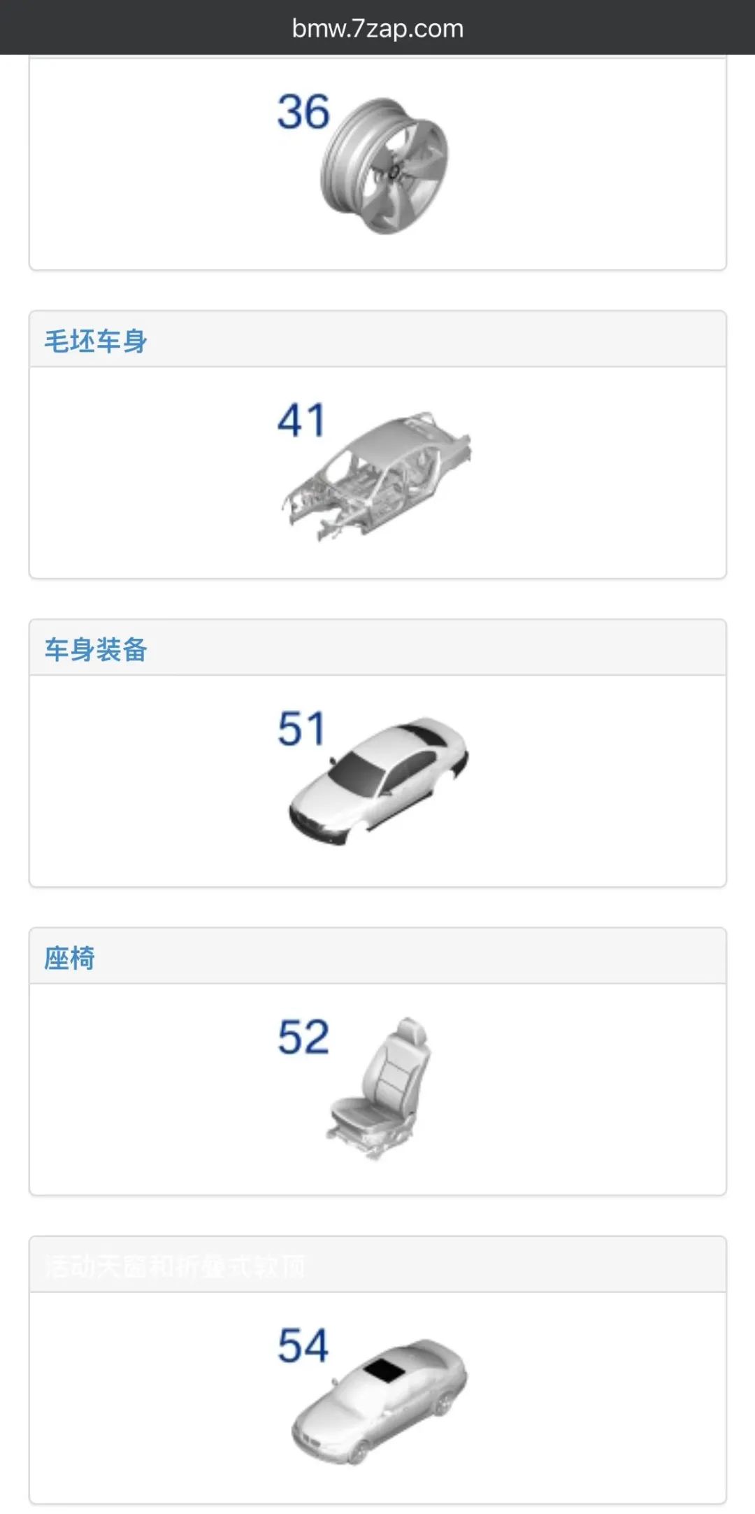 那么如果有的配件上面你找不到零件號怎么辦,這里就要提到寶馬的ETK系統(tǒng)了。通過ETK系統(tǒng),無論是配件商或者個人,都可以在上面找到零件,而且圖文并茂,你可以通過損壞的位置的圖例索引到你要找的零件和零件號,再通過這個給配件商報去。如圖所示,你可以根據(jù)大致位置先定位分類,比如開頭為41的零件就是bodywork相關(guān)的,51就是trim相關(guān)的零件。