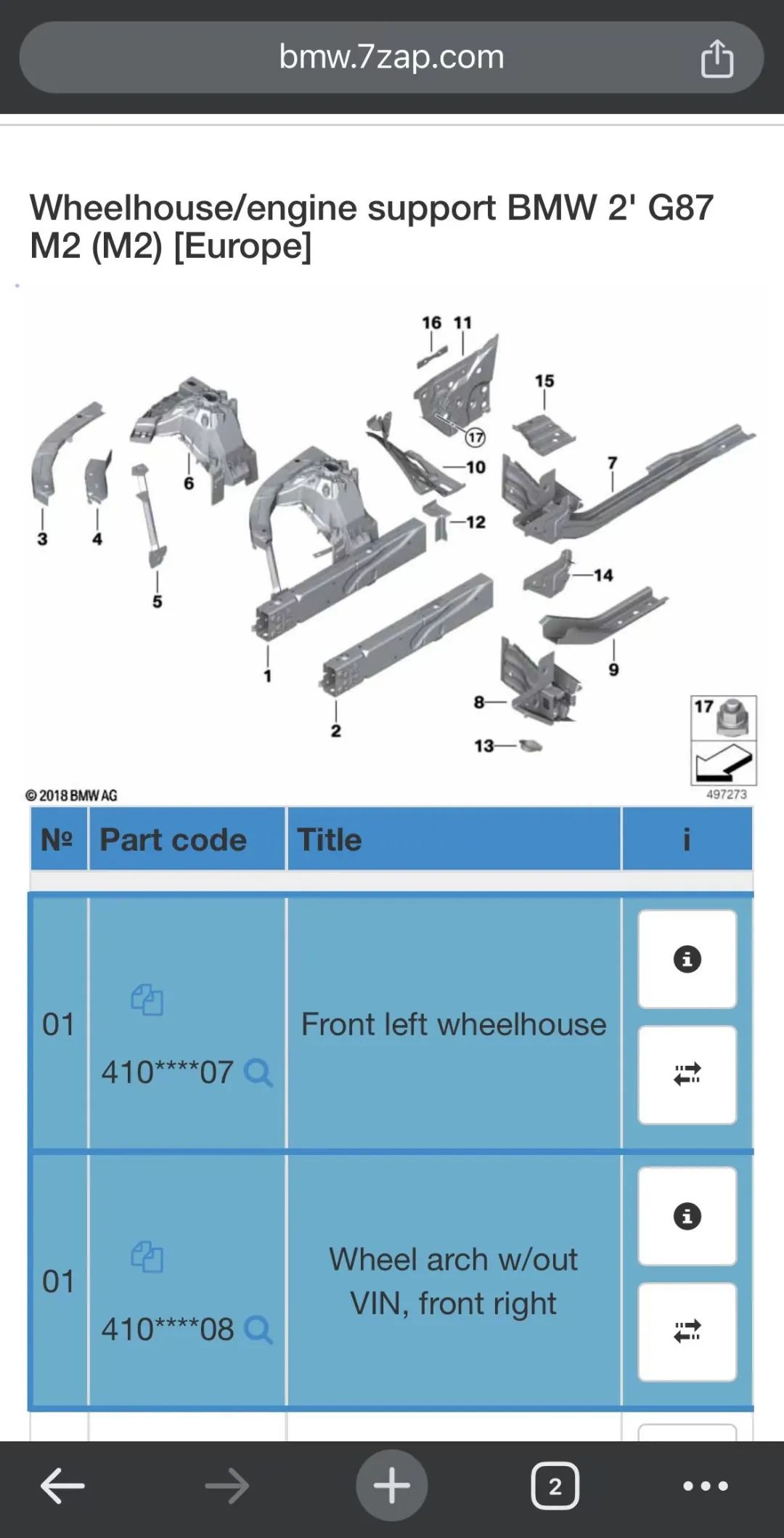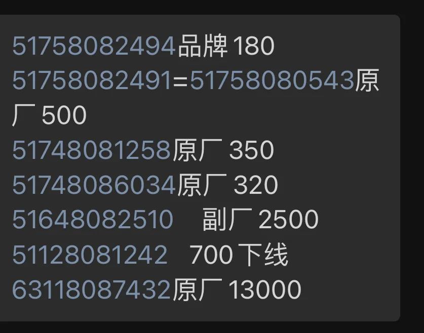 找到零件后,可以把所有所需零件合成一個表格,發(fā)給配件商讓他報價。這里就有另一個學(xué)問,報價的零件可能有好幾種價格,包括全新原廠訂貨,全新原廠現(xiàn)貨,全新原廠下線件,全新副廠品牌件,拆車原廠件。同樣的東西價格有所不同,以G87 M2為例,由于這個車子非常新,幾乎沒有拆車件,所以只能訂新件,但是有一些部位塑料件的原廠價格非常高,這時候可以選用一些品牌副廠件,他們?nèi)允窃瓘S開模,合裝孔位,但是價格會低一半甚至更多。