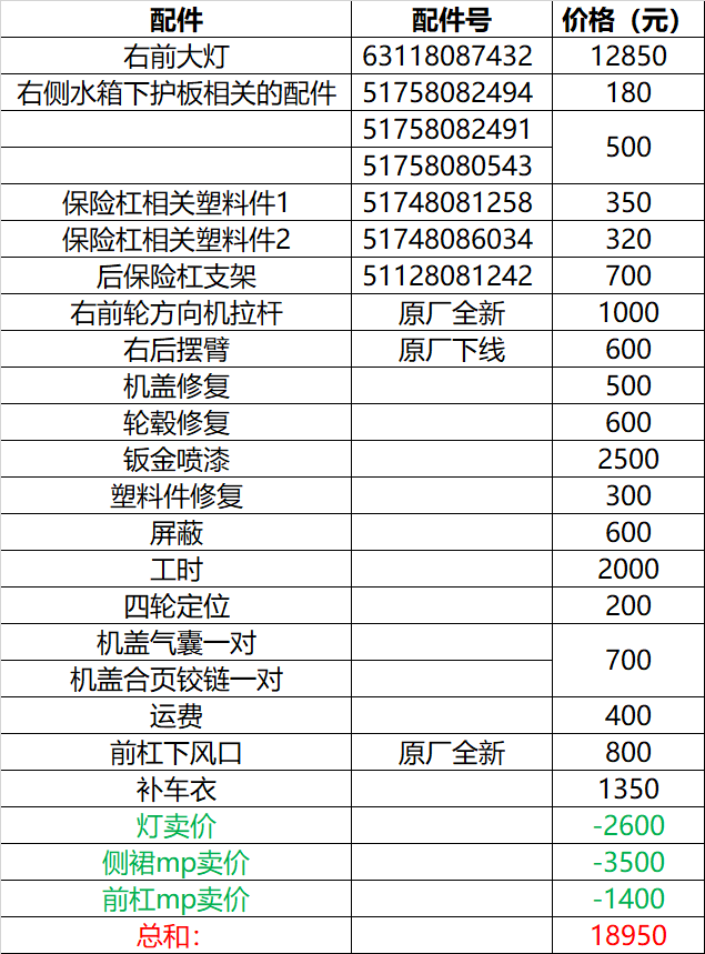 以上便是我的修車歷程。最終花費(fèi)25000元+,其中最高的費(fèi)用就是原廠的全新大燈13000元。除去賣掉的改裝包圍和壞的大燈,最后凈花費(fèi)19000元。這還是在沒有使用任何拆車件的情況下,其實(shí)對于一臺進(jìn)口的M來說,已經(jīng)是很小的成本了,當(dāng)然,這里也要感謝配件商和改裝店,給到了非常合理的價格。