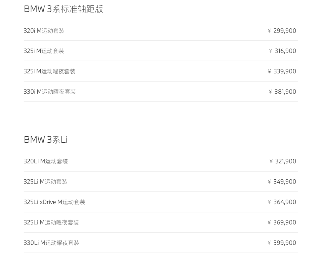 目前,寶馬3系在國內售賣5款長軸車型+4款標軸車型。