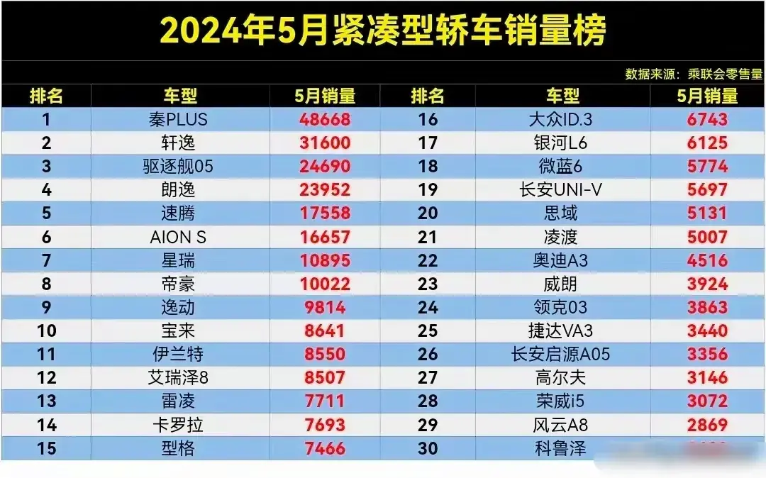 風(fēng)水輪流轉(zhuǎn),在這場新能源與燃油車的角逐賽中,我國自主品牌通過不斷的技術(shù)攻關(guān),在新能源汽車領(lǐng)域已實(shí)現(xiàn)彎道超車,合資燃油車曾經(jīng)的霸主地位已然不保。根據(jù)乘聯(lián)會(huì)發(fā)布的2024年5月緊湊型轎車銷量榜來看,銷量突破1萬輛大關(guān)的車型共有8款,新能源車型秦PLUS以絕對(duì)的優(yōu)勢登頂榜首,繼續(xù)蟬聯(lián)冠軍。曾經(jīng)風(fēng)光無限的燃油車銷冠王軒逸這次痛失冠軍,退居二線,獲得亞軍。驅(qū)逐艦05表現(xiàn)也很不錯(cuò),獲得季軍。朗逸和速騰都進(jìn)入前五名。逸動(dòng)、寶來、帝豪、星瑞、AION S都進(jìn)入榜單前十名。太慘了!5月緊湊型轎車銷量榜,軒逸丟冠,朗逸第4名,帝豪第8名