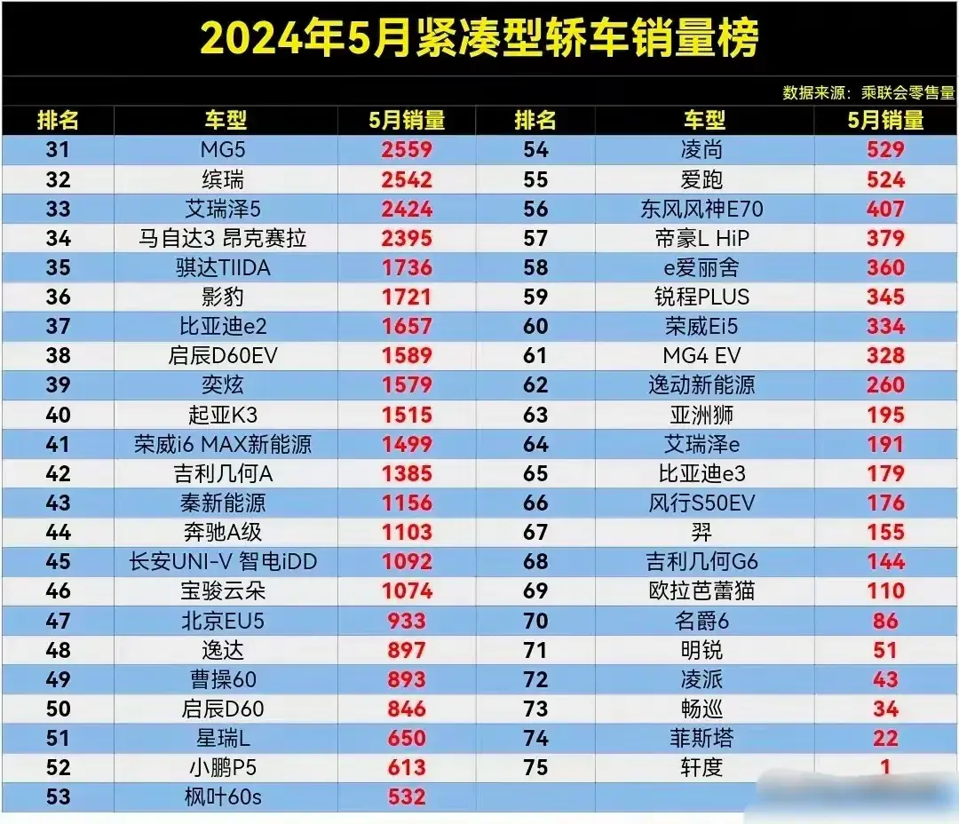 31-75排名中,寶駿云朵、奔馳A級(jí)、秦新能源、起亞K3、吉利幾何A、奕炫、啟辰D60EV、比亞迪e2、影豹、馬自達(dá)3 昂克賽拉、艾瑞澤5、繽瑞、MG5表現(xiàn)還可以,都在1千-2千多輛。北京EU5、逸達(dá)、小鵬P5、星瑞L、曹操60、楓葉60s、愛跑、凌尚、表現(xiàn)都一般,銷量都在5百-9百多輛。東風(fēng)風(fēng)神E70、a愛麗舍、瑞程PLUS、MG4 EV、榮威Ei5、亞洲獅、逸動(dòng)新能源、艾瑞澤e、比亞迪e3、吉利幾何G6、名爵6、凌派等表現(xiàn)都不佳,銷量都在500輛以下,還需多努力才行。