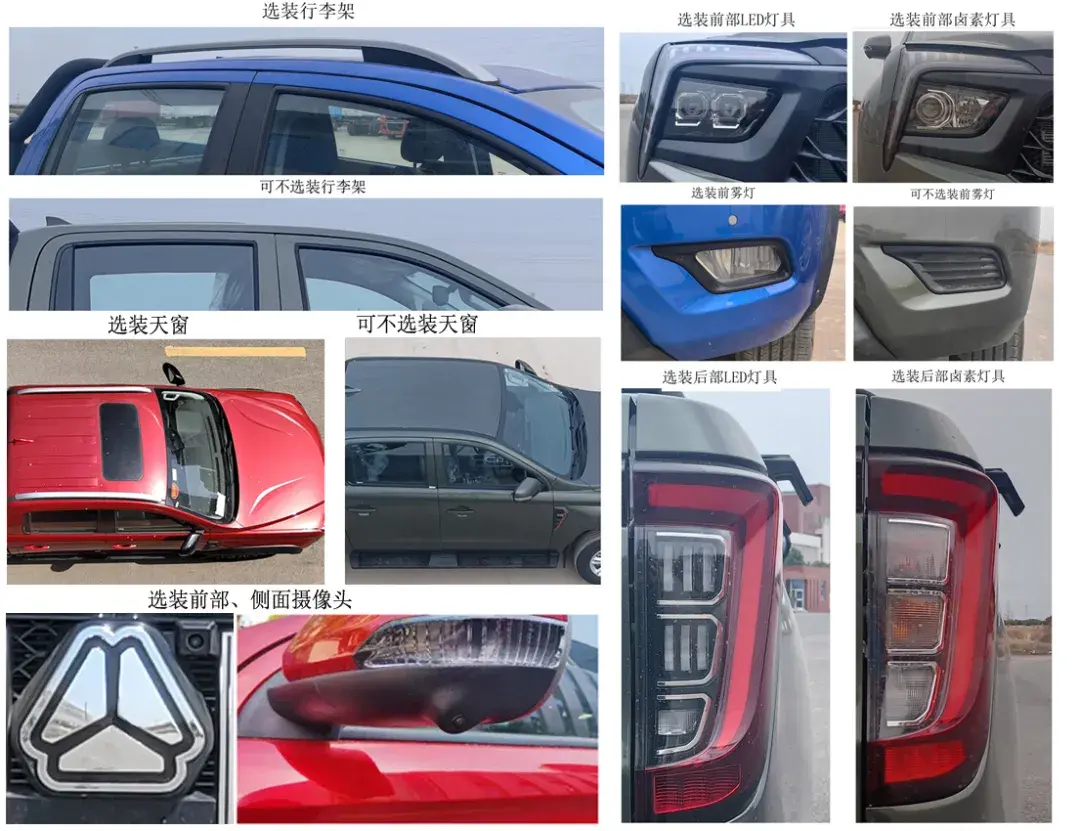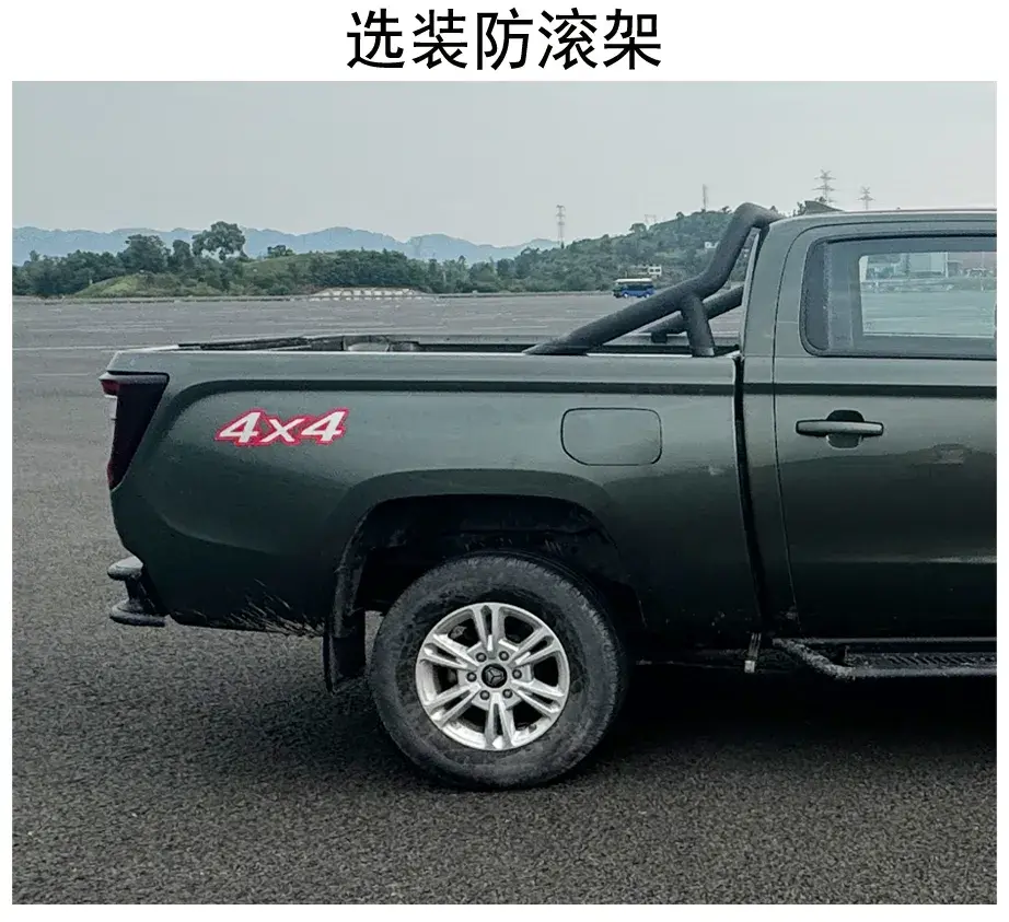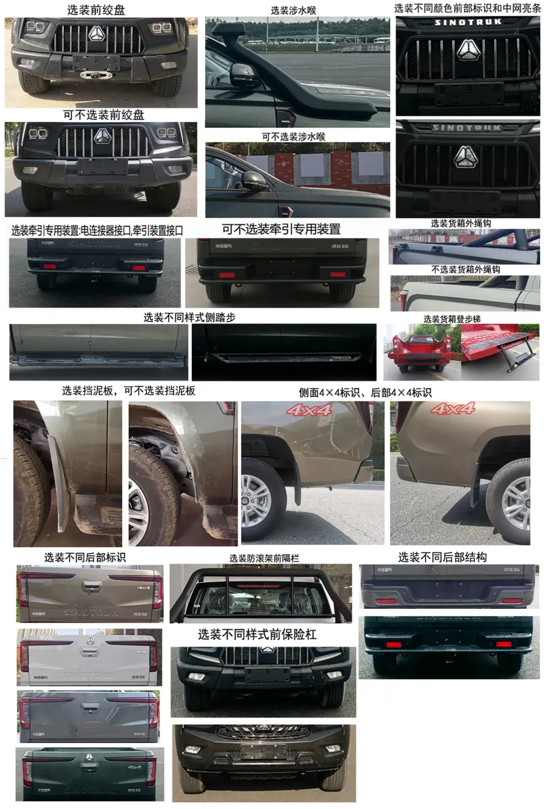 中國重汽皮卡越野版長貨箱車型配備17英寸輪轂,還可支持選裝前部和后部鹵素燈具、外繩鉤、攝像頭、天窗、不同后部標識、側面4×4標識、后部4×4標識、防滾架前隔欄、前絞盤、貨箱登步梯、行李架、涉水喉。選裝不同樣式側踏板。并且針對前保險杠提供不同樣式,后部結構也提供了多種造型可選。
