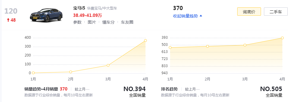 寶馬i5在今年1月上市,推出了5款車型,純電長軸距版售價區(qū)間為43.99-46.59萬元。不過寶馬i5的上市也沒有得到消費者的認可,1-4月寶馬i5的銷量為5輛、16輛、90輛、370輛,累計銷量不過500,屬實難以入目。