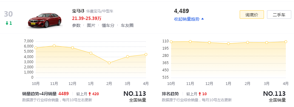 寶馬i3是華晨寶馬旗下的一款中型純電轎車,在2023年3月上市,可以說是寶馬3系的純電版,僅在中國市場銷售。行業(yè)認為,寶馬i3的推出是為了在中國市場和特斯拉Model 3、小鵬P7、蔚來ET5等純電中型轎車競爭。但是寶馬i3的銷量并不樂觀,4月的銷量也僅有4489輛。