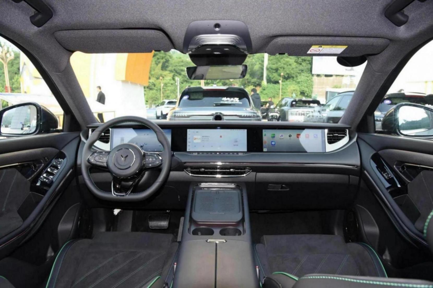 嵐圖FREE 318 的內部結構也與 超長續(xù)航智駕版車型相似。它的中控臺有一個由三個獨立屏幕組成的大聯(lián)屏,還有一個 D 形三輻方向盤,轉向柱上還安裝有變速桿。 中控臺扶手還兩個無線手機充電板和兩個杯架。