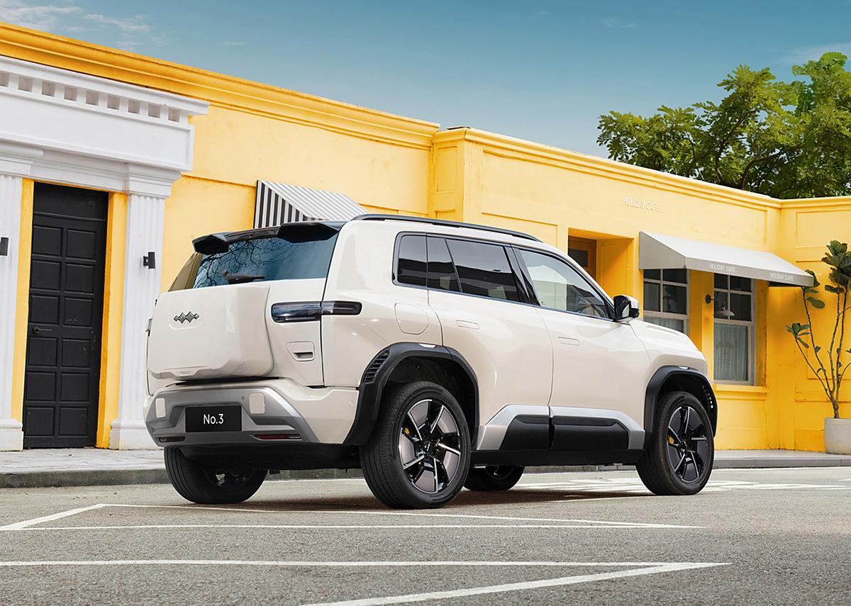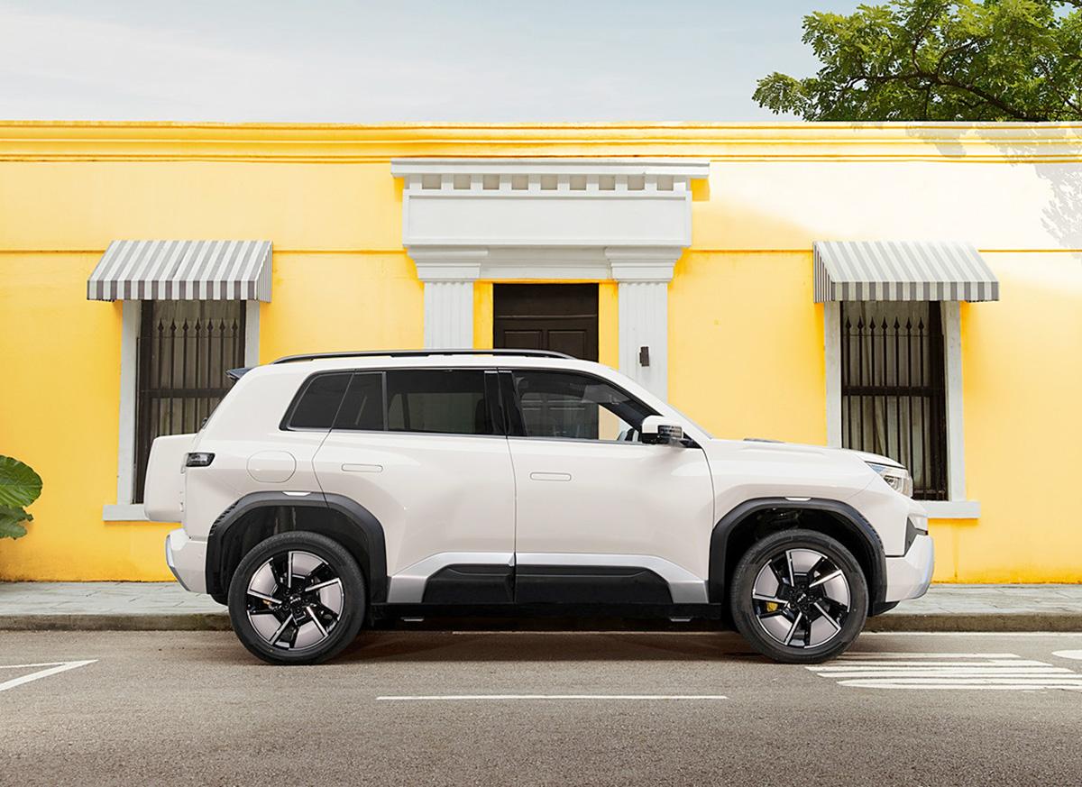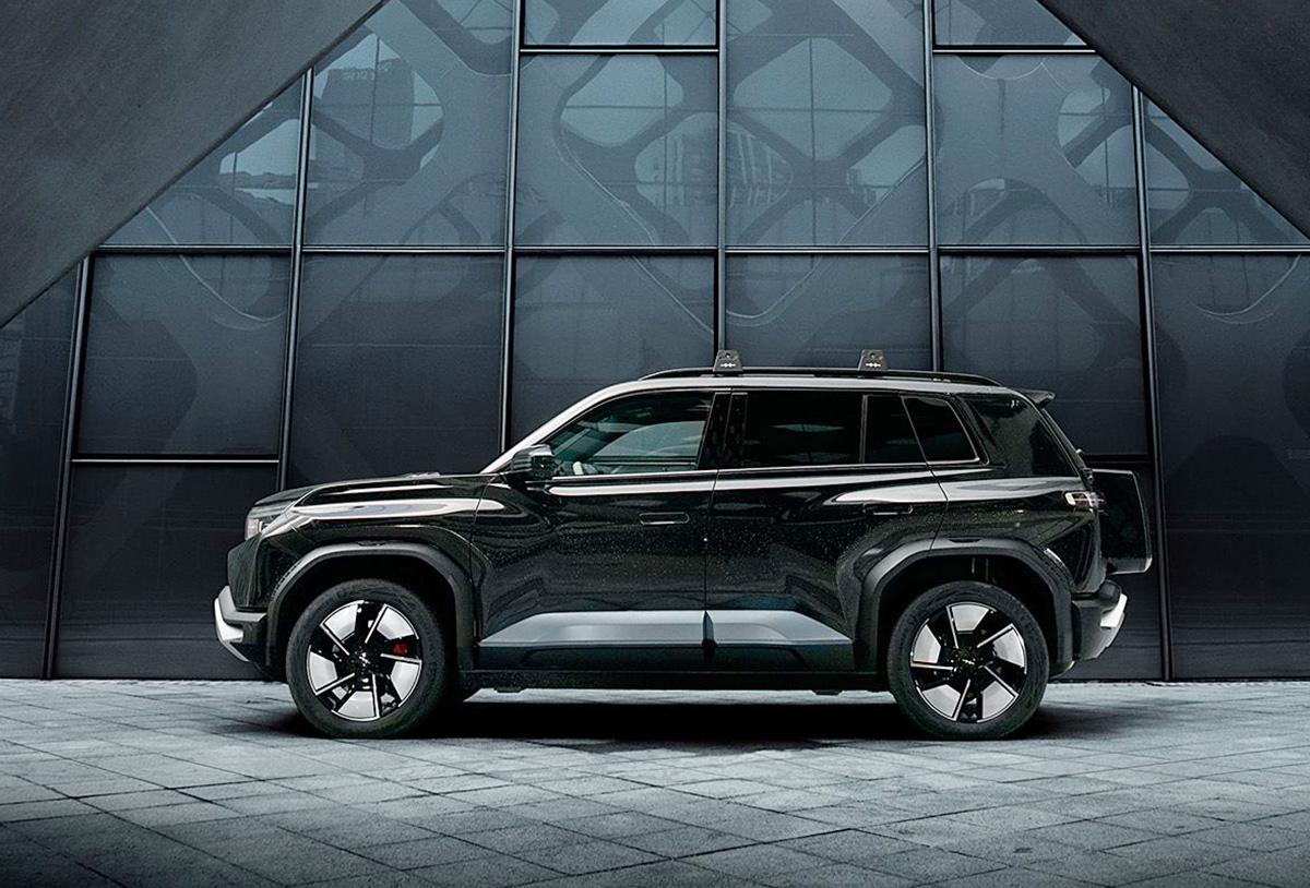 車身側(cè)面造型很硬朗,使用了很有肌肉感的線條和塊面設(shè)計,前后翼子板向外隆起,翼子板和輪眉銜接位置是內(nèi)凹結(jié)構(gòu),在前輪眉的前部還帶有進(jìn)氣孔,后輪眉的后側(cè)則是帶有散熱孔的造型。車身下護(hù)板是很有立體感的隆起造型,車門把手為彈出式結(jié)構(gòu)。