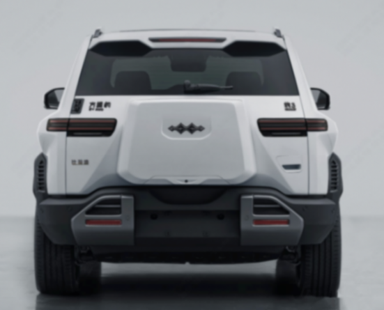 在車的尾部,我們可以看到方程豹豹3的肌肉感也很強,它采用的是前傾效果的后擋風玻璃,后擋風玻璃的占比面積很小,車尾部還有一個造型不是很規則的小背包的設計,布局在正中間的位置。車的尾燈采用的是絲狀風格,底部的包圍采用的是很突出的設計。