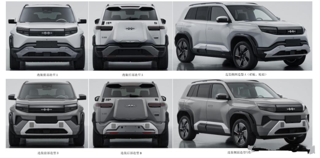 在申報的細節方面,我們可以看到方程豹豹3共有三種風格的前臉可選擇,三種風格的前臉的上半部分設計都相同,主要區別在中間的位置以及底部的部分,車的中間分別采用起伏效果或者煙斗狀的空氣導流槽,最底端采用游戲手柄狀的包圍,底部的造型差別很大。此外,車的尾部的底部包圍也都和前臉采用相同的設計,因此底部的包圍差別也很大。