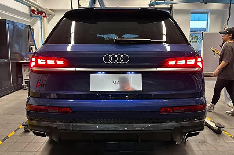 在車的尾部,新款奧迪Q7繼續采用層次分明的設計,新車采用的是前傾效果的后擋風,展現出了它運動化的一面。車的尾燈采用非常粗獷的設計,尾燈的下方有貫穿式的鍍鉻條點綴,中間的位置采用內凹式的輪廓,車的底部是突出的包圍。