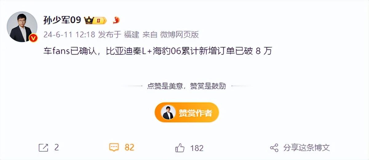 6月11日,“車fans”創(chuàng)始人孫少軍扔出一則重磅消息,比亞迪最新車型秦L+海豹06累計訂單已超過8萬臺。之前網(wǎng)傳聞秦L銷量火爆,這次得到了側(cè)面印證,但此消息并未得到比亞迪官方的證實。