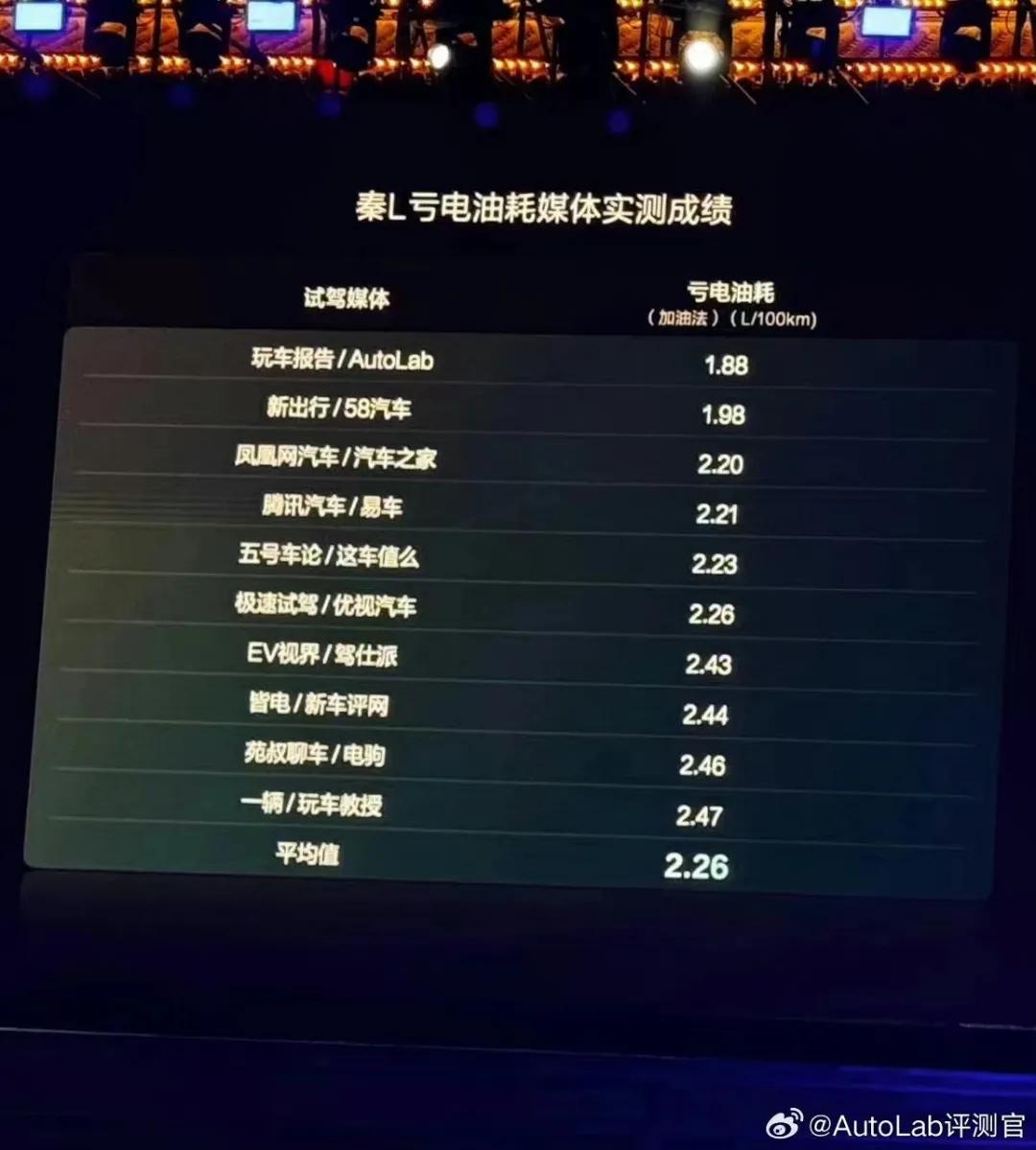 當大家認為上述續航不可能得時候,又有一條信息讓網友直接炸鍋了,秦L 的媒體試駕實測成績顯示,百公里最低饋電油耗僅有1.88L,最高2.47L,平均2.26L。這個數據比官方公布的2.9L甚至低了1L的水平。