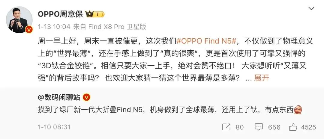 OPPO的新一代折疊屏Find N5,那可是要在驍龍8至尊版平臺里第一個登場。它加入了“極致輕薄”的隊伍,展開厚度大概只有4mm,跟兩枚一元硬幣差不多厚,這輕薄程度,直接登頂全球第一梯隊。