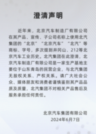 6月7日,北汽集團(tuán)也對(duì)外發(fā)布了一則澄清聲明。根據(jù)官方表述:北京汽車制造廠有限公司與公眾熟知的北汽集團(tuán)并無關(guān)系。請(qǐng)消費(fèi)者謹(jǐn)慎鑒別,北汽集團(tuán)不對(duì)相關(guān)產(chǎn)品售后及服務(wù)承擔(dān)任何責(zé)任。