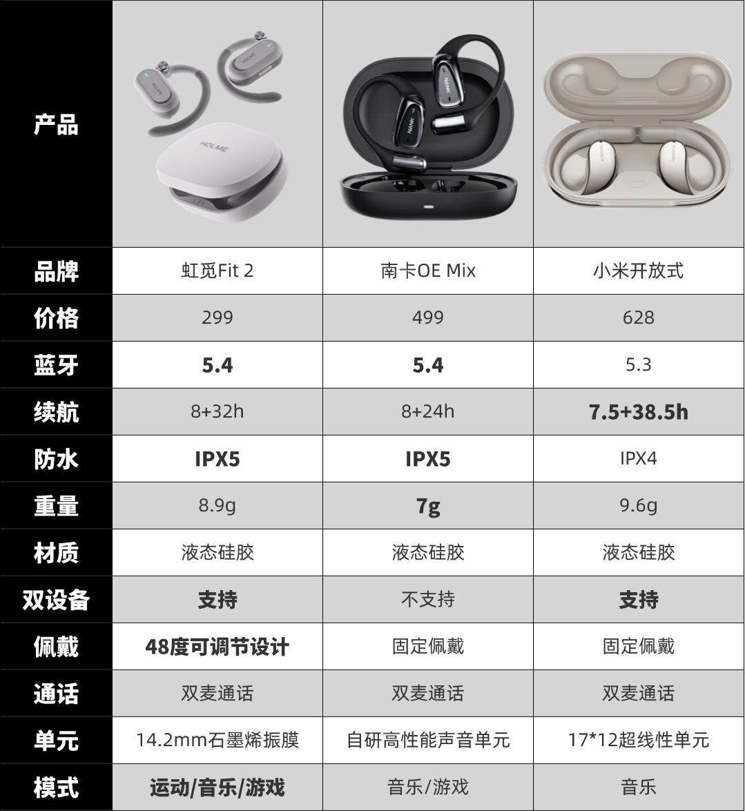 不知道大家有沒有發(fā)現(xiàn),入耳式的耳機(jī)越來越少人使用了,取而代之的是開放式的耳機(jī),大概也是因?yàn)榇蠹沂褂枚鷻C(jī)的頻率越來越高,而開放式更適合長時間去使用,所以大家也更愿意去使用開放式耳機(jī),有很多的耳機(jī)大廠上新了不少的開放式耳機(jī),大家都不知道選擇哪款好,所以今天帶來了三款熱門開放式耳機(jī)的測評體驗(yàn),分別是虹覓FIT 2,小米開放式耳機(jī),南卡OE Mix。