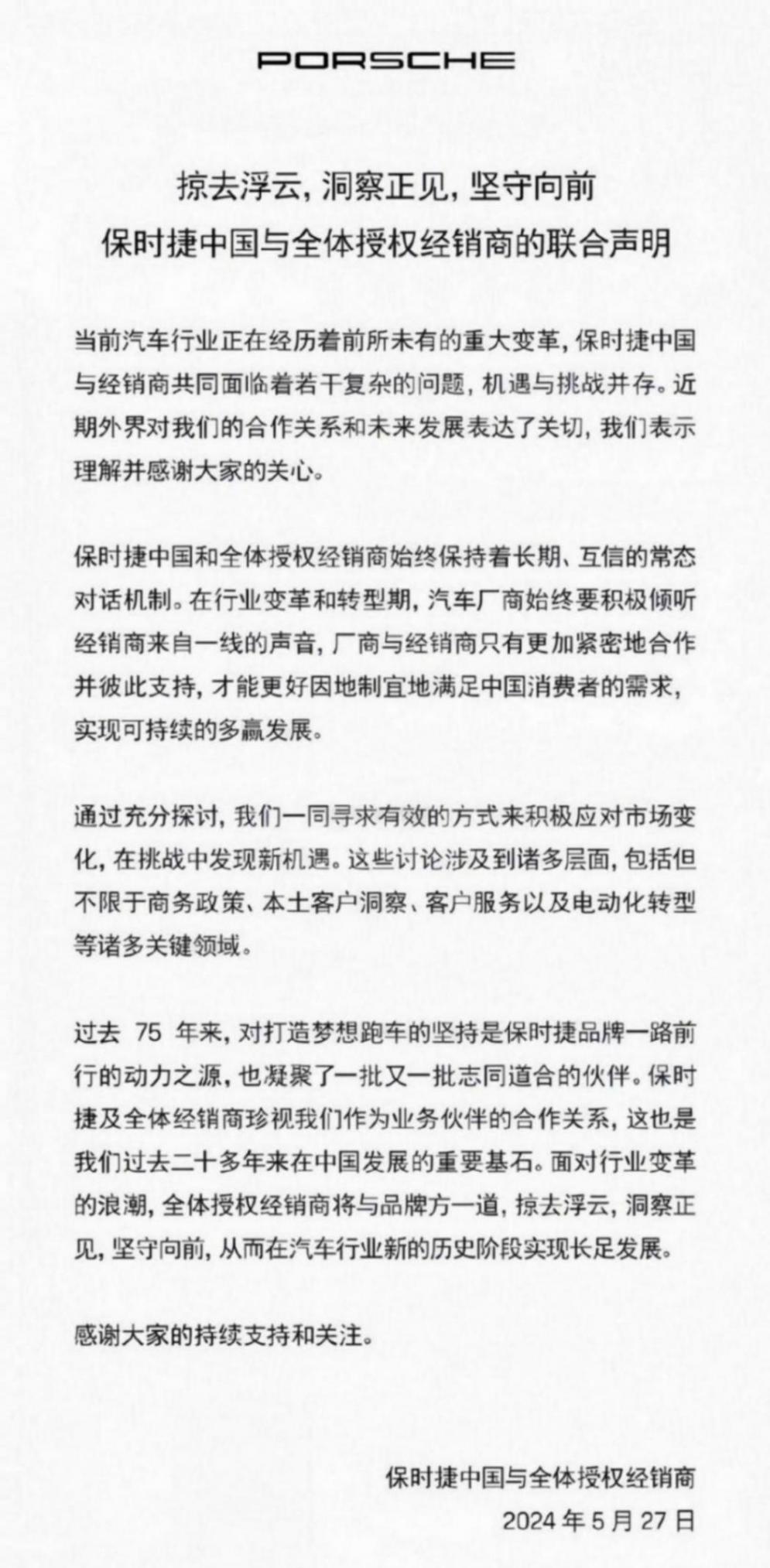 因經(jīng)銷商的反抗,5月27日,保時捷中國發(fā)布聲明,表示將與經(jīng)銷商一同尋求“有效的方式”來積極應(yīng)對市場變化,在挑戰(zhàn)中發(fā)現(xiàn)新機遇。“這些討論將涉及諸多層面,包括但不限于商務(wù)政策、本土客戶洞察、客戶服務(wù)以及電動化轉(zhuǎn)型等諸多關(guān)鍵領(lǐng)域。”