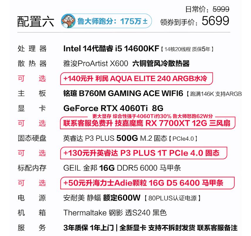 電源是600W,采用了雅浚六銅管風冷散熱,加140元升級到240水冷。提供3年質保。