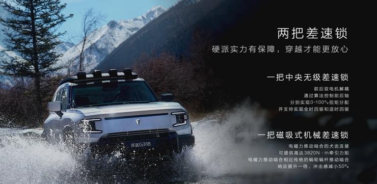 深藍(lán)G318配備18.99kWh和35.07kWh磷酸鐵鋰電池,CLTC純電續(xù)航分別為100km、174km、184km和190km。此外,該車底盤采用了前雙叉臂+后五連桿獨立懸架系統(tǒng),高配車型提供魔毯空懸+CDC,軟硬高低可調(diào),并配備全時四驅(qū)系統(tǒng)、雙重差速鎖、R-EPS轉(zhuǎn)向系統(tǒng),以及6kW外放電功能。