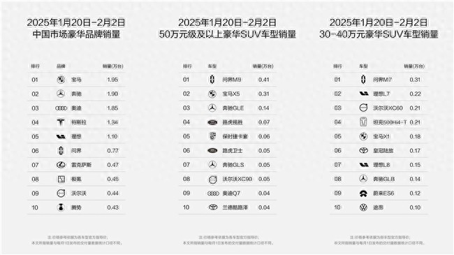在2025年的第4至5周,問界在中國市場豪華品牌銷量中處于前列,問界M9穩(wěn)坐50萬元級及以上豪華SUV車型銷量周榜第一,而作為2024年中國新勢力的年度銷冠,問界新M7在今年1月持續(xù)保持著30萬級中國新勢力車型的TOP級銷量,其斷層領(lǐng)先的實(shí)力有目共睹。
