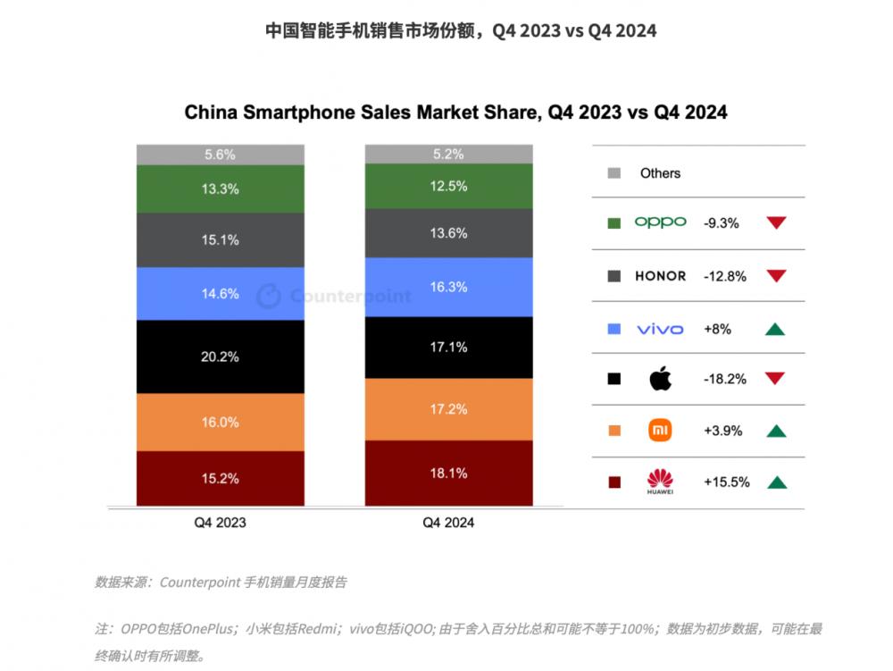 Counterpoint數(shù)據(jù)顯示,2024年第四季度,華為以18.1%的市場(chǎng)銷售份額躍居中國市場(chǎng)榜首,全年銷售同比增長(zhǎng)36.4%,成為頭部廠商中增幅最大的品牌。