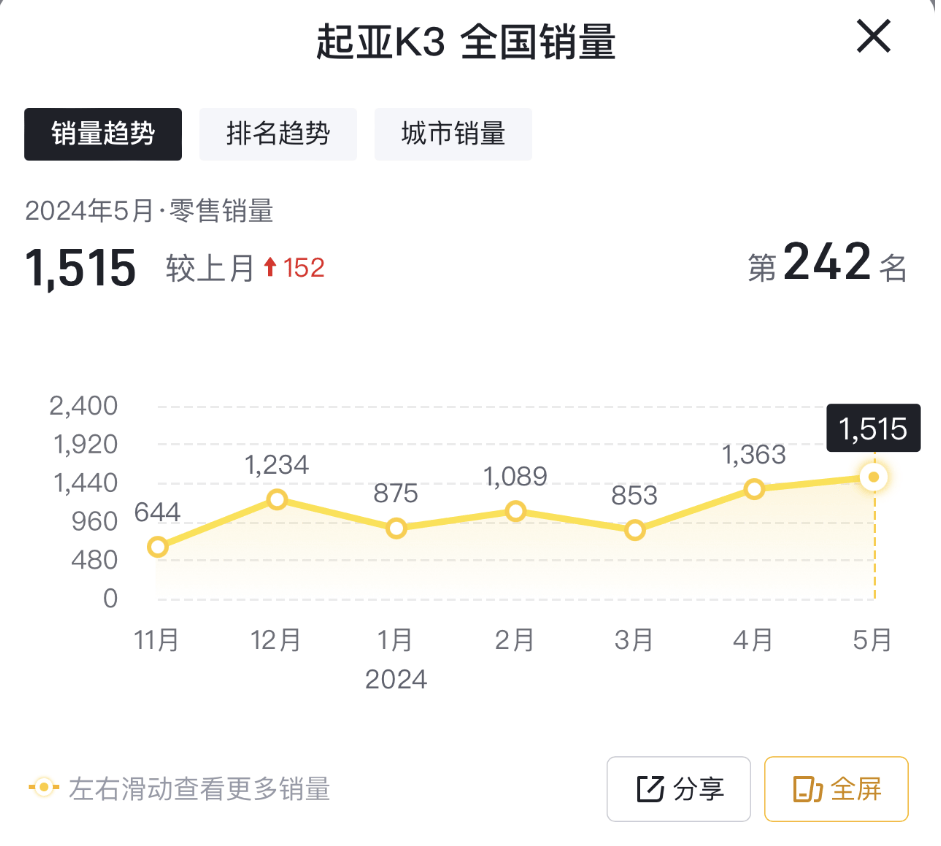另一方面、行業(yè)綜合銷量數(shù)據(jù)顯示,2024年1-5月份,起亞K3的單月零售銷量分別為875臺、1089臺、853臺、1363臺、1515臺。
