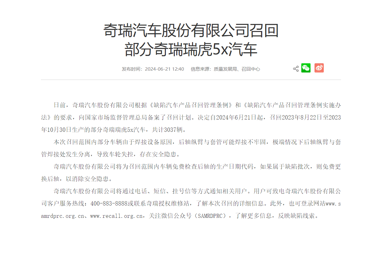 國家市場監督管理總局官網最新消息顯示,奇瑞汽車決定召回部分瑞虎5X車型。不過,本次召回涉及到的車輛并不多,僅為3037臺。
