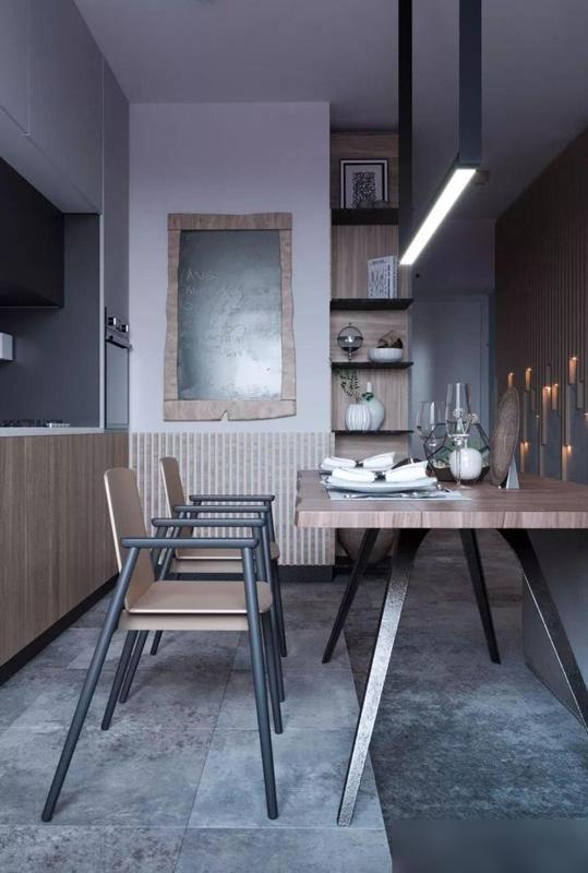 在色彩的搭配上,婆婆選擇了深灰色作為主色調, 在整個客廳1/3的面積上鋪設深灰色地磚,選擇深灰色的石膏板吊頂、以及深灰色的沙發和窗簾,整個空間的色調呈現出冷靜的深色調,適合大多數人,也很有時代感,運用這種深灰色系的家具搭配,外面看起來大氣高級, 里面又搭配暖色調的原木色家具,呈現了溫暖又舒適的氣氛,這樣的色調搭配豈不是很和諧?