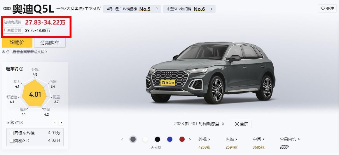當然了,眼下普通人如果是想要去入手一臺奧迪Q5L,其實門檻也沒有那么的高。要知道,指導價39.75-48.88萬的新車,現(xiàn)在經(jīng)銷商那邊報價也已經(jīng)給到了27.83-34.22萬元,等于說最低配的奧迪Q5L裸車最低不到28萬就能提,那這顯然已經(jīng)親民了許多。