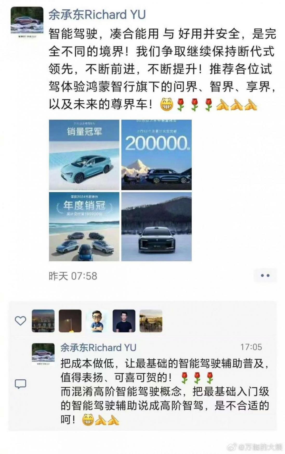余承東在朋友圈評論區還發文表示,把成本做低,讓最基礎的智能駕駛輔助普及,值得表揚、可喜可賀的!而混淆高階智能駕駛概念,把最基礎入門級的智能駕駛輔助說成高階智駕,是不合適的呵!