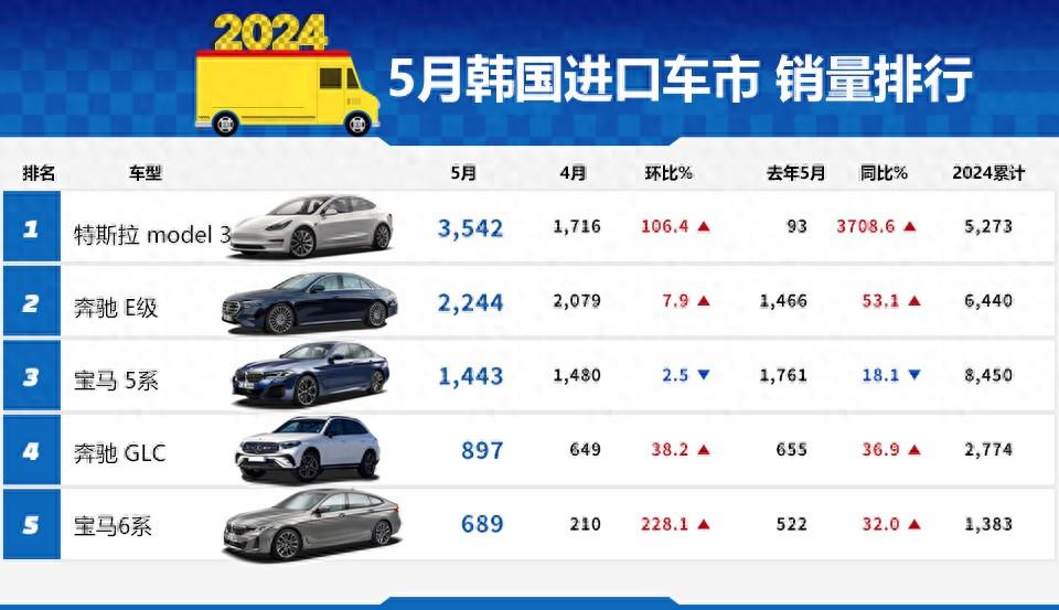 2024年5月韓國進口轎車銷量為24116輛,比去年(21417輛)增長12.6%。在寶馬和梅賽德斯-奔馳爭奪第一的激烈競爭中,特斯拉銷量激增,帶動了氣氛。