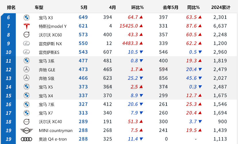 上個月Model 3售出3542輛,登上了進口車的頂峰。截至4月,累計銷量僅為1731輛,一次進口量是1-4月銷量的兩倍。今年累計銷量也一舉飆升至第四位(5273輛)。