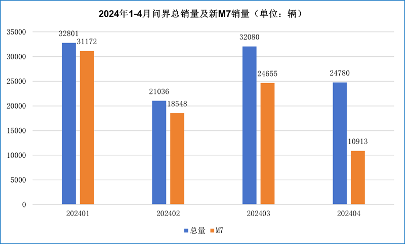 問界新M7的銷量穩定對華為與賽力斯都非常重要,因為新M7是問界名副其實的銷量擔當。交強險數據顯示,2023年問界總上險量為92656輛,其中,M7和新M7為58849輛,占比63.5%。2024年1-4月,問界總上險量為110697輛,其中,新M7為85288輛,占比進一步提升至77%。