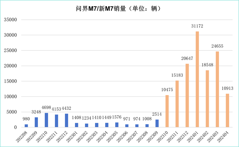 問界M7于2022年7月發布,最初的售價為31.98萬-37.98萬元,同年8月開始交付,但市場表現高開低走。