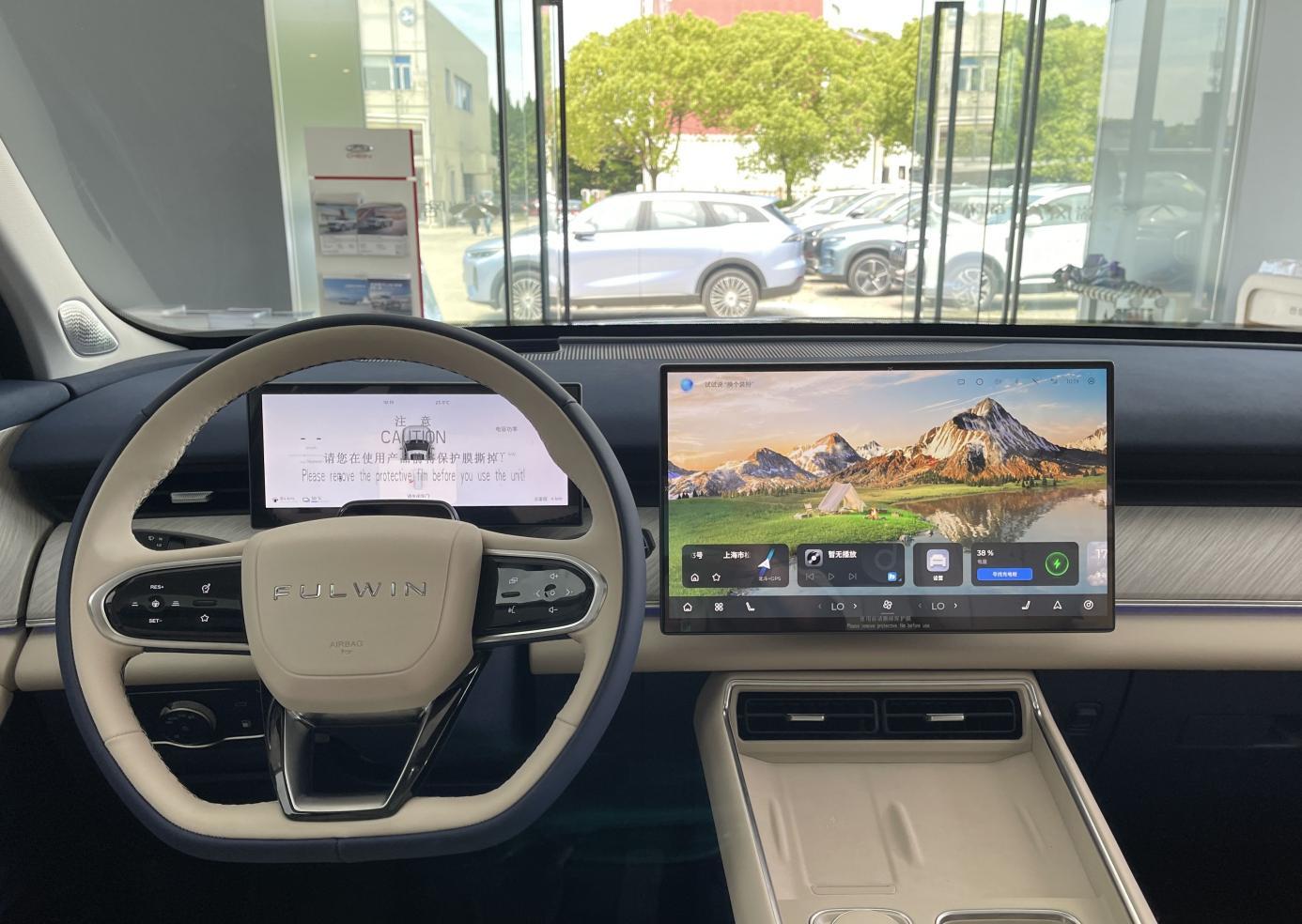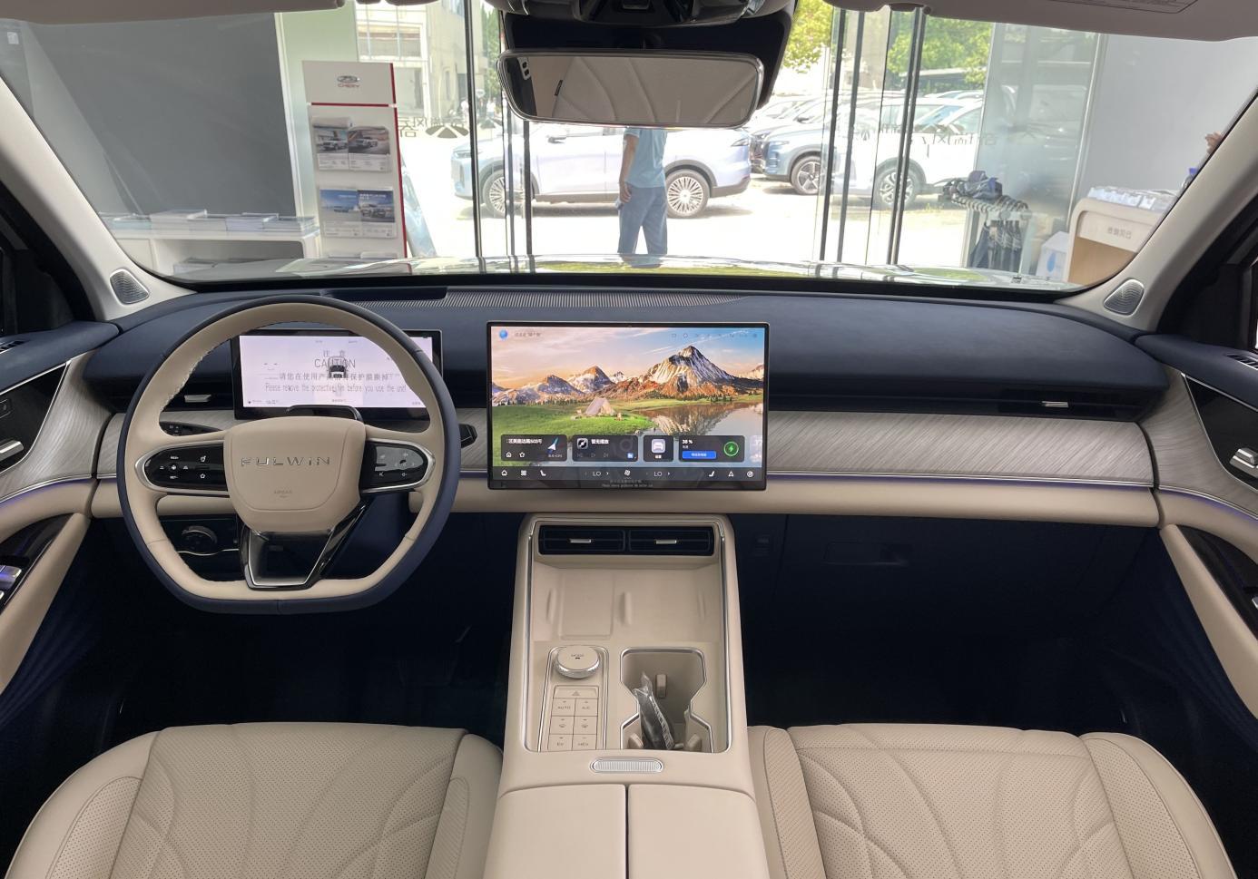 方向盤采用內外拼色的設計,看起來更有質感,展車為真皮材質,觸感不錯。前方是10.25英寸的全液晶儀表盤,邊框略粗,不過考慮到價格,問題不大。中控屏呈懸浮式,尺寸為15.6英寸,分辨率2.5K,內置驍龍8155芯片,沒上8295有點小遺憾。功能方面,支持CarPlay、HiCar、雙區域語音識別、聲紋識別等。