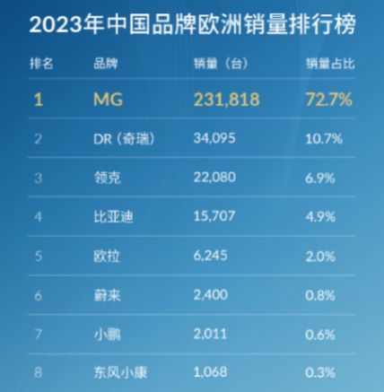 鑒于MG品牌具有英國血統(tǒng)的歷史淵源,使得該品牌在進(jìn)軍歐洲市場時(shí),相比其他國產(chǎn)品牌更具備天然的競爭優(yōu)勢。在2023年的中國品牌歐洲銷量排行榜中,僅MG一個品牌,就在歐洲市場賣出了超過23萬臺整車,占據(jù)中國品牌總量的超7成。正所謂“歐洲市場每賣出10輛中國車,就有7輛是MG”。