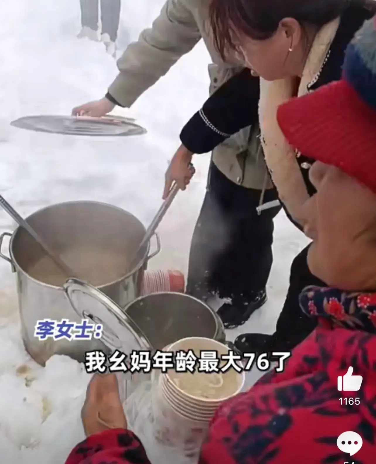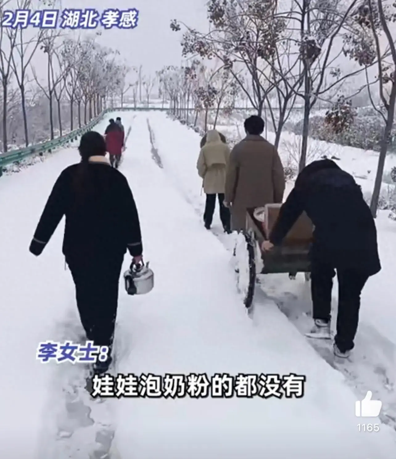 2月4日,湖北孝感。一群村民雪地推車,給滯留司機送熱乎美食。當事人李女士稱,他們送去了熱水和柴火土灶烹飪的當地特色美食“豆絲”。一兩里地的距離走了20多分鐘送到,76歲的幺媽也主動要求加入,豆絲送去還是熱乎的,讓司機吃的也很暖和。李女士表示,她們08年堵車挨過餓,當時沒人送餐,自己淋過雨,更想為別人打傘。
