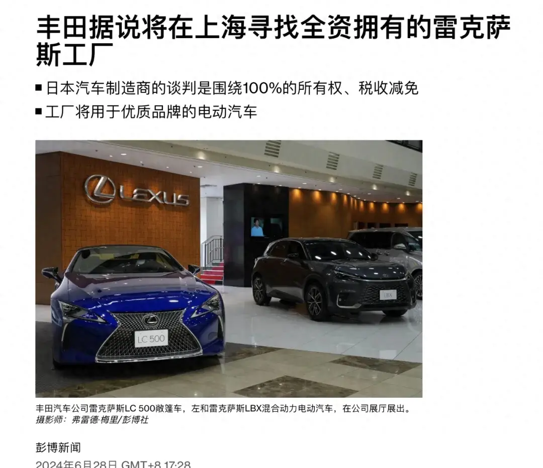今日,資訊巨頭彭博社報(bào)道稱,日本豐田集團(tuán)旗下的高端豪華汽車(chē)品牌雷克薩斯計(jì)劃在中國(guó)上海設(shè)立獨(dú)資工廠。