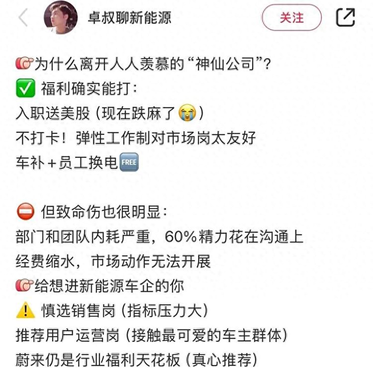 部門和團隊內耗嚴重,60%的精力花在溝通上,經費縮水,市場動作無法開展。”在小紅書一篇題為“為什么離開人人羨慕的‘神仙公司’?”的筆記中,某離職蔚來汽車的員工給出了這樣的離職理由。